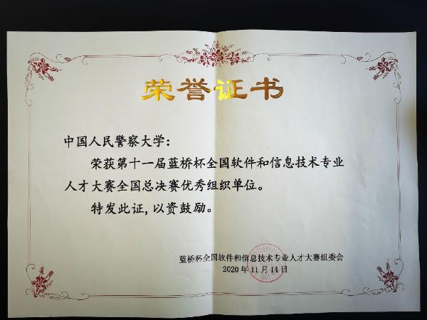 2020年11月14日,智慧警務(wù)學(xué)院網(wǎng)絡(luò)安全與執(zhí)法教研室組織并指導(dǎo)9名選手在第十一屆藍(lán)橋杯全國軟件和信息技術(shù)專業(yè)人才大賽總決賽中斬獲桂冠,在C/C++軟件開發(fā)大學(xué)B組項目中獲得全國二等獎3項、全國三等獎4項,全國優(yōu)秀獎2項的好成績,我校獲得全國優(yōu)秀組織獎。