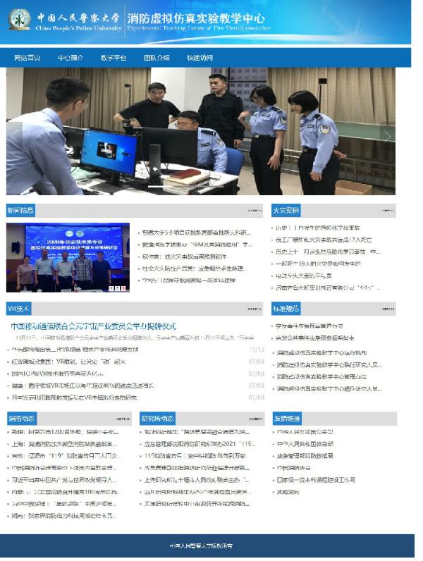 在救援指揮學院黨委的關心支持下,根據教育部對虛擬仿真實驗教學中心建設及教學中心自身發展的要求,在學校信息網絡管理中心王煒老師與教學中心VR興趣小組成員的共同努力下,2021年11月11日,中國人民警察大學消防虛擬仿真實驗教學中心(國家級)網站正式上線運行。