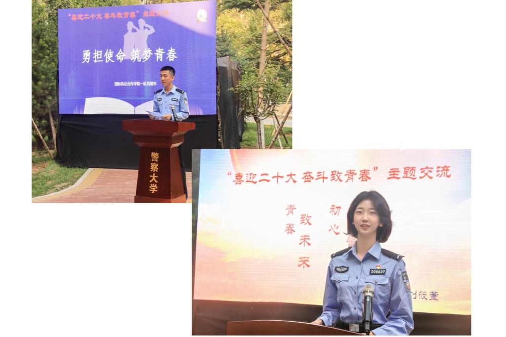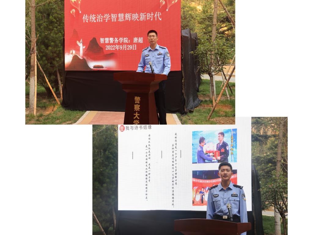 活動邀請了教師、學生代表和三位畢業(yè)校友,講述他們書香為伴,砥礪前行的成長歷程。智慧警務學院唐超教授,暢談了汲取傳統(tǒng)治學智慧,做大學問、真學問的學術追求;滕凱楓同學從詩詞中感悟家國情懷,抒發(fā)了從警報國的志向;畢業(yè)校友何召華、楊勤敞和丁成穩(wěn),錄制視頻述說了他們立足本職學習實踐、錘煉本領建功立業(yè)的奮斗足跡;劉筱萱和肖清水同學作為“青春對話未來——寫給十年后的自己”書信征集活動獲獎代表,展望了如何在新時代踔厲奮發(fā)、如何勝任未來的公安工作。活動現(xiàn)場展出的“警大閱讀十二時辰”攝影比賽優(yōu)秀作品,記錄了警大學子從晨光微熹到暮色四合,不負韶華爭朝夕的美好閱讀瞬間,展現(xiàn)了警大豐富多彩的閱讀文化氛圍。