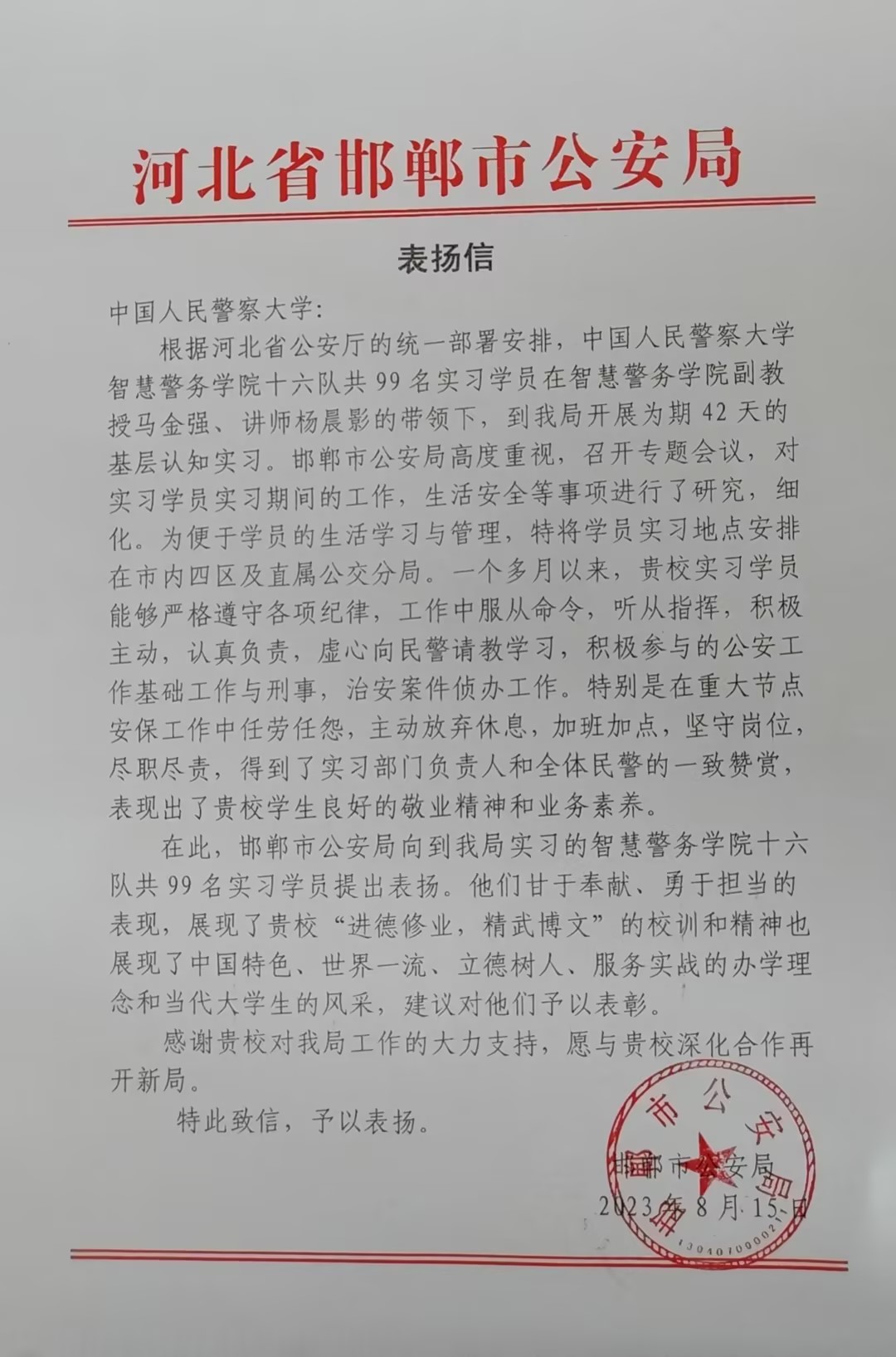 每一名警大學子始終以飽滿的工作熱情、嚴謹的工作態度堅守在各自的崗位上,充分展現了警大學子的優良作風和精神風貌,得到了實習單位與群眾的高度評價。實習期間我校學生共收到群眾錦旗26面、單位通報表揚5次、感謝信10封。