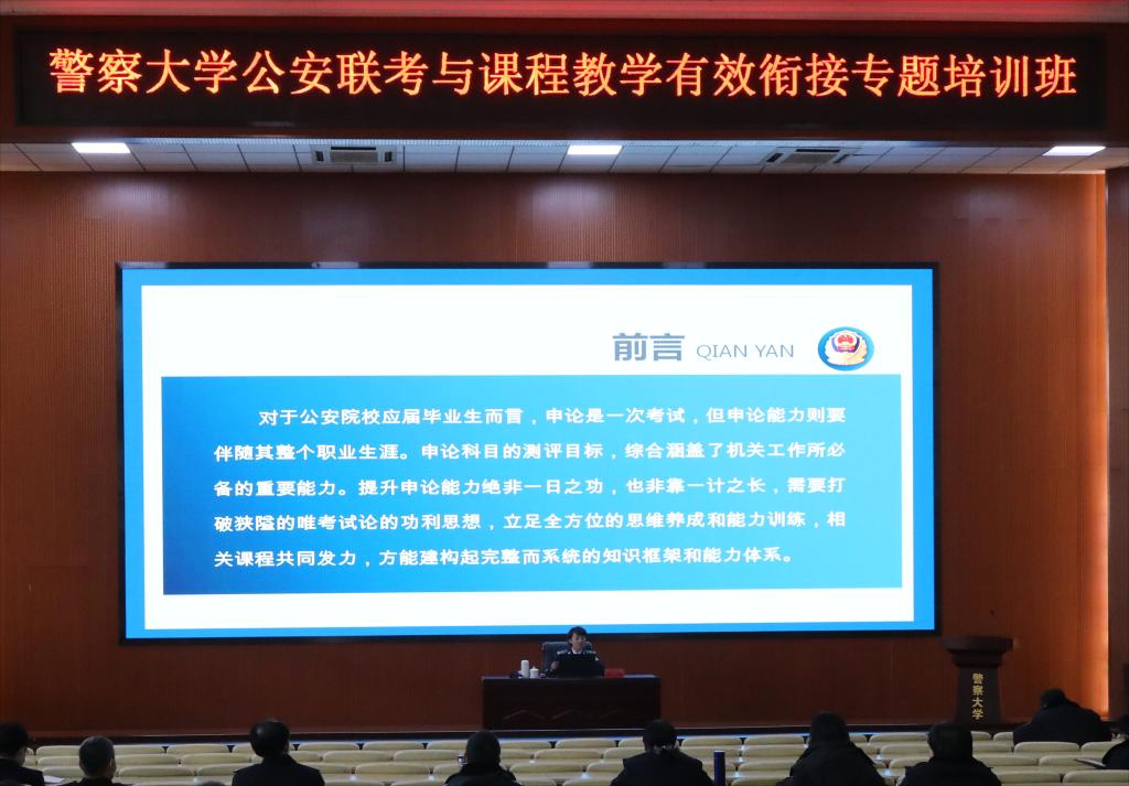 專題培訓班”。本次培訓班設計了申論、行測、公安專業(yè)知識等公安聯(lián)考相關科目與教師日常課程教學相融合的專題培訓內容。11月30日下午,本次培訓班在學校報告廳順利開班,邀請山東警察學院專業(yè)基礎教研部公文寫作教研室主任寇紅副教授作開班第一講。各學院領導、教研室主任、全體無課教師參加了本次培訓。