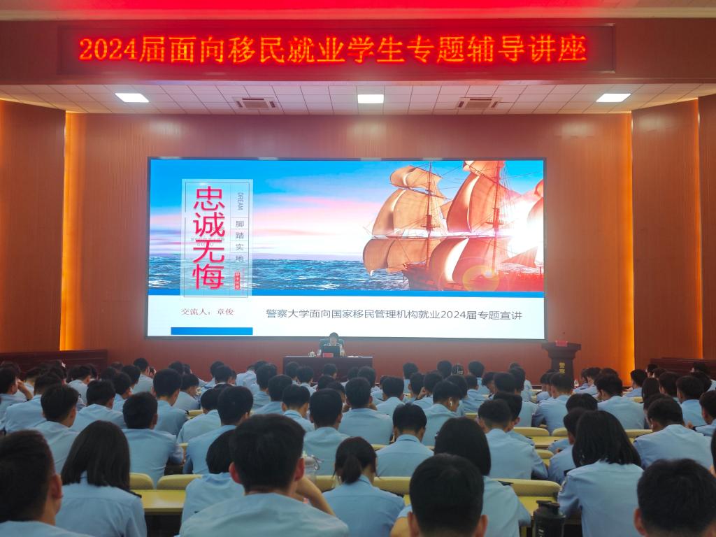 為進一步教育引導廣大青年學子增強對移民管理工作的職業認同感、使命感和榮譽感,堅定職業自信,筑牢忠誠使命的思想根基,以職業精神點亮信仰之光,以飽滿的熱情和昂揚的斗志奔赴工作崗位,矢志不渝做黨和人民的忠誠衛士,5月31日下午,學校邀請國家移民管理局常備力量第二總隊政委章俊同志來校面向移民管理系統就業學生開展畢業教育專題講座。講座由王震總務長主持,2020-2021級面向國家移民管理機構就業的600余名同學認真聆聽了授課,整場講座歷時兩個半小時。