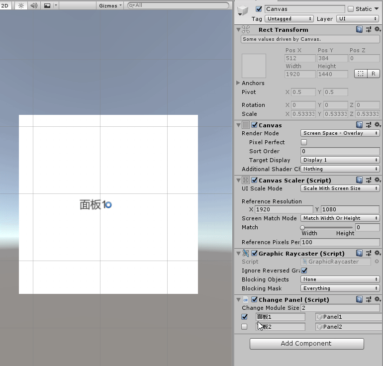(4)將ChangePanel.cs腳本組件添加到任意對象,現在就可以在不運行的狀態下控制UI界面了: