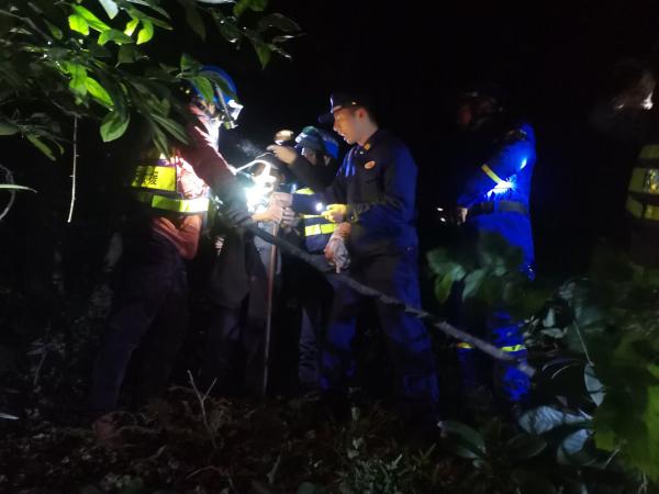 此時夜幕降臨,山里氣溫已降至十度左右,老人衣著單薄,已在山上滯留了近9個小時。山林面積廣闊,搜救任務迫切且困難重重,救援人員加快救援的腳步。21時50分,終于在距離村子很遠的山上找到了老人,只見老人癱坐在地,體力不支,消防隊員在給老人補充了食物和水之后,立刻帶老人下山。因老人行動不便,且山路崎嶇,消防隊員把老人小心翼翼地背下山。晚上22時20分,眾人成功將老人送達項山鄉村委會,并給老人準備了熱茶和食物。