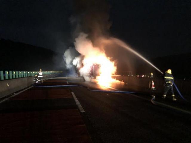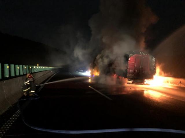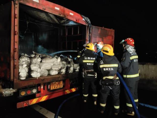 12月20日凌晨1時12分,贛州市夏蓉高速崇義段汝城往崇義縣方向有一輛掛車著火,崇義縣消防救援大隊接警后調派一輛搶險救援車、一輛水罐車及14名消防指戰員趕赴現場。