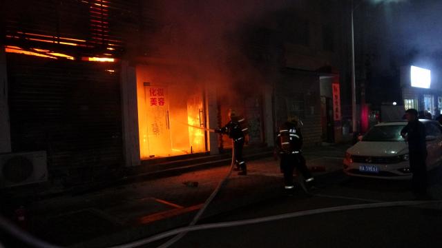 消防救援人員立即架設起多把水槍進行滅火撲救,在水槍的掩護下,進入店鋪內,將液化石油氣瓶轉移至安全地帶。經過約二十分鐘的緊張撲救,明火被成功控制。隨后,消防救援人員又對店面起火部位持續出水,冷卻降溫防止復燃。