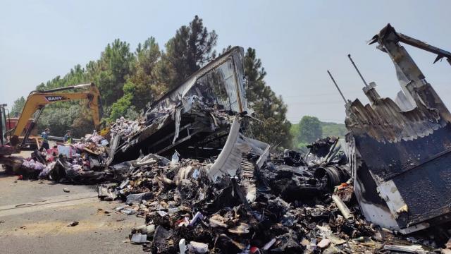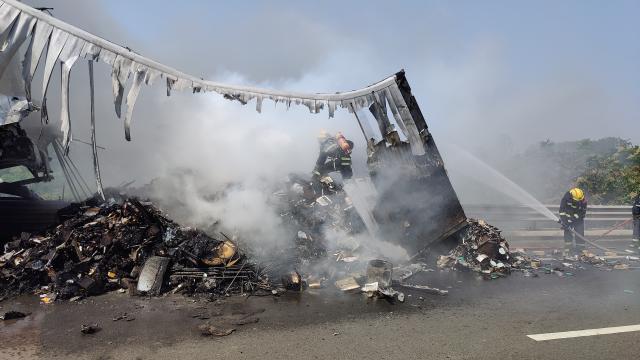 據(jù)該貨車司機(jī)回憶,大火是從貨車貨箱內(nèi)燃起,火勢蔓延得很快,“不到一分鐘整個(gè)后車廂就全部燒了起來”。他沒辦法滅火,只能退到高速柵欄外報(bào)警求助。