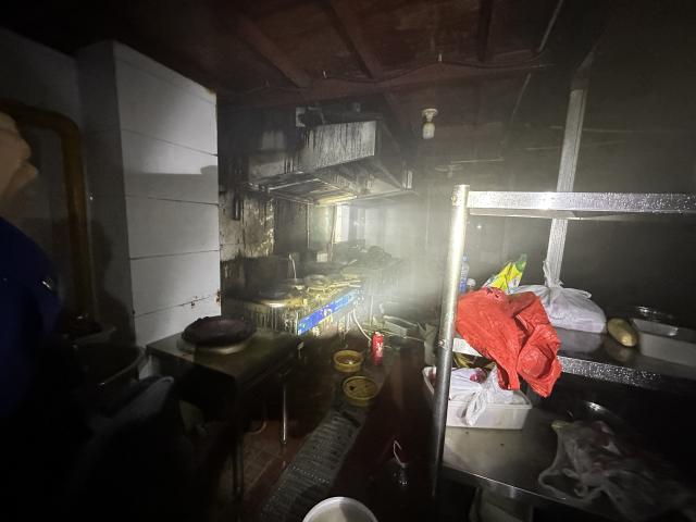 據了解,發生火災時正值營業高峰期,后廚在用油鍋炒料過程中,油溫過高,突然起火,引燃周邊的紙皮、天花板等,隨后,蔓延至油煙機外面的管道。工作人員第一時間用滅火器進行撲救,但由于火勢蔓延較快無法控制,隨即撥打119電話報警。