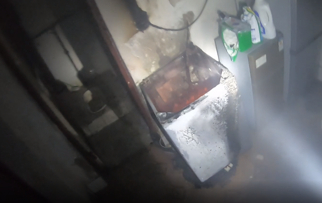 消防救援人員到達(dá)現(xiàn)場附近,由于巷子道路狹窄,消防車無法進(jìn)入,救援人員手提救援器材步行進(jìn)入現(xiàn)場。現(xiàn)場為宿舍樓3樓插座短路起火,引燃一旁的洗衣機(jī)、冰箱等家電。消防救援人員了解情況后,立即展開滅火,同時(shí)打開房間窗戶進(jìn)行散煙處理。幾分鐘后,火勢(shì)得到了控制,所幸撲救及時(shí),未造更大損失。隨后,消防員將被燒毀的洗衣機(jī)抬至室外。