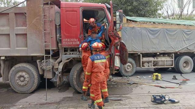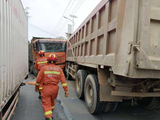 12月13日13時,贛州市南康區蓉江街道稍江村兩輛貨車相撞,1人被困。接警后,當地消防救援人員迅速趕赴現場處置。