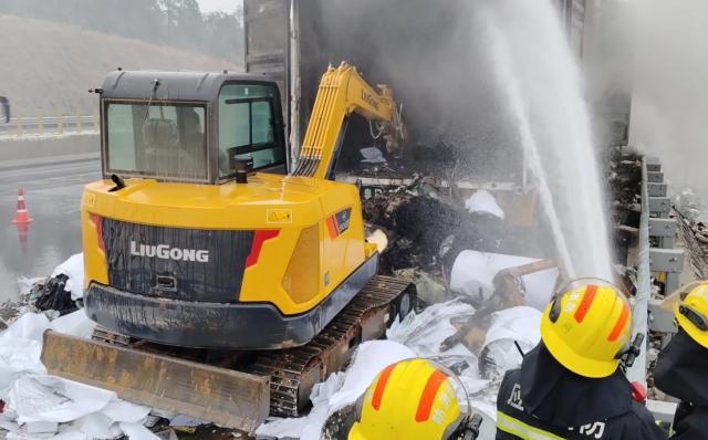 指揮員立即組織滅火小組出兩支水槍對貨車車廂進行控制蔓延,并用火鉤在車尾把貨物鉤下,由于里面燃燒的都是厚重的貨物且積壓在車廂里,無法完全撲滅。現(xiàn)場指揮員立即協(xié)調(diào)安排挖機幫忙,在挖機的幫助下,消防員迅速把車廂里的余火清理干凈。
