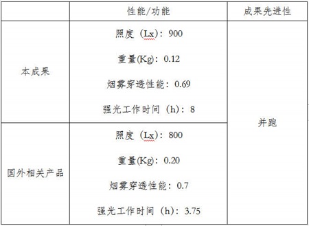 該成果依托部消防局應用創(chuàng)新計劃項目《滅火救援個人照明技術研究》(項目編號:2012XFCX05),突破了消防照明燈具使用時間和壽命短、穿透黑煙能力差的技術難題,研究了濃煙環(huán)境下消防員照明燈具性能測試平臺并提出產品應用設計需求,形成了相關測試技術和方法,研制了佩戴式照明燈,制定了產品性能指標要求,解決了目前我國消防員配備的照明燈,在實際應用中存在的穿透煙霧能力差、工作時間短、便攜與防爆性不好等問題。