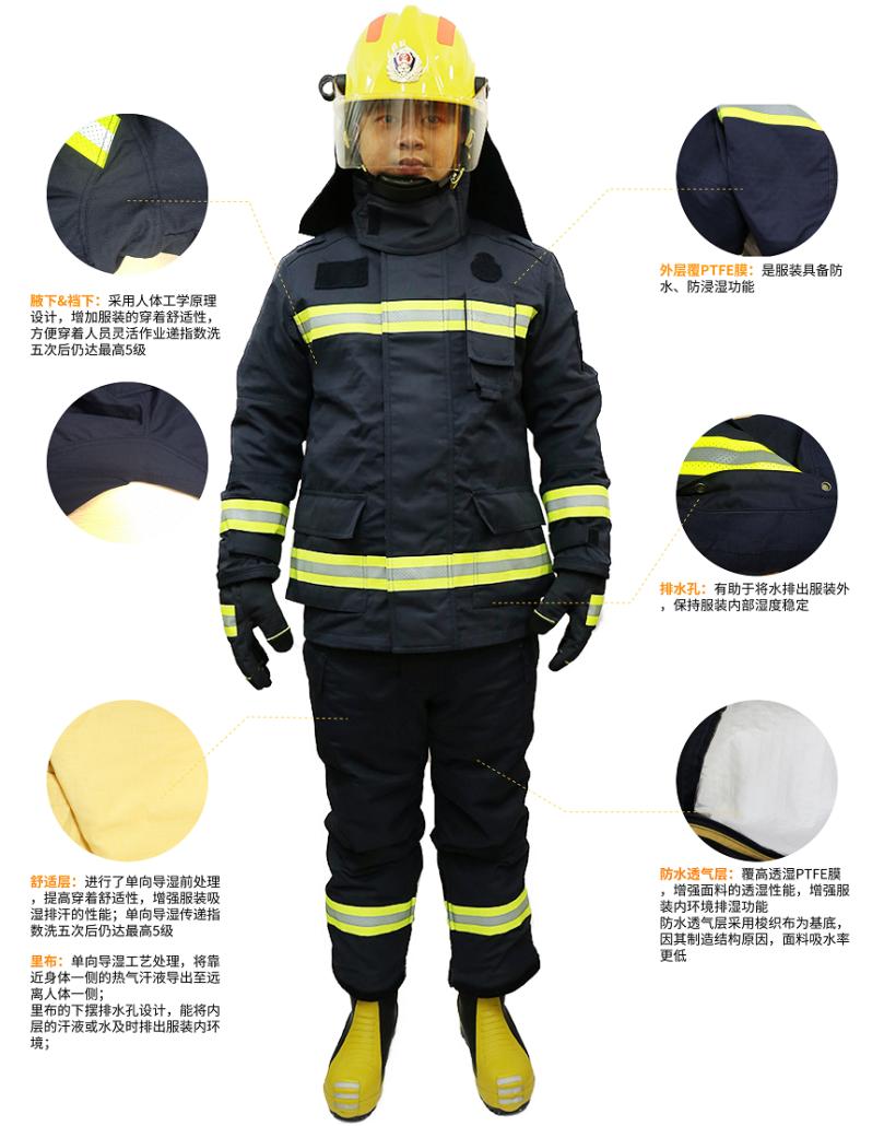 導(dǎo)濕抗浸型消防員滅火防護(hù)服在符合XF10-2014《消防員滅火防護(hù)服》行標(biāo)所有參數(shù)要求,同時(shí)還具有抵抗浸濕以及導(dǎo)出汗?jié)n的技術(shù)特點(diǎn)。該裝備由內(nèi)側(cè)覆高透膜的外層、梭織布覆膜的防水透氣層、單向?qū)裨O(shè)計(jì)的舒適層組成。針對(duì)抗浸性能,外層內(nèi)側(cè)覆膜可以有效抵御外部噴水,同時(shí)防水透氣層的基材從無(wú)紡布替換成了梭織布、進(jìn)而有效減少了液體的吸收,進(jìn)而大幅降低了裝備因吸濕導(dǎo)致的中量增加。普通服裝浸濕試驗(yàn)后吸濕增重1454%,新服裝吸濕增重只有56%,即遠(yuǎn)低于普通服裝的30%。針對(duì)導(dǎo)濕性能,舒適層進(jìn)行了耐洗滌的持久單向?qū)裾恚鋯蜗驅(qū)駛鬟f指數(shù)O可達(dá)最高的5級(jí),與皮膚接觸的舒適層能夠快速將汗?jié)n導(dǎo)出到外部,同時(shí)設(shè)計(jì)了用于汗滴排出的排汗孔道,保證了皮膚的干爽。同時(shí)采用了高透膜設(shè)計(jì),織物覆膜后的透濕率性能超過(guò)了8000g/(24h·m2),整體裝備的濕阻參數(shù)為12.9m2·Pa/W滿足了歐標(biāo)EN469不高于30m2·Pa/W的要求、熱損失參數(shù)為328.2W/m2滿足了美標(biāo)NFPA1971不低于205W/m2的要求,進(jìn)而有力保障了消防員在南方等濕熱環(huán)境下的安全舒適。