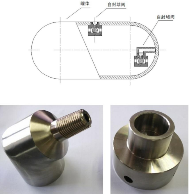 儲(chǔ)罐(瓶)內(nèi)置重力式防護(hù)應(yīng)急自封堵裝置主要由閥本體、配套閥芯(重力球)、或防爆驅(qū)動(dòng)活塞缸等組成,安裝在儲(chǔ)罐(瓶)進(jìn)出料、放空閥等所有罐體內(nèi)部介質(zhì)通道處。該裝置正常工況條件下依靠自身重力與閥座脫離保持介質(zhì)通道暢通,緊急狀態(tài)下如在儲(chǔ)存、運(yùn)輸和使用過(guò)程中出現(xiàn)閥、減壓閥、管線等泄漏時(shí),只需滾動(dòng)罐或瓶體(大于45度),球形閥芯和錐形閥芯在自身的重力作用下與各自對(duì)應(yīng)的閥座密封面匹配壓緊形成兩道密封,阻斷內(nèi)外介質(zhì)通道,可緊急切斷泄漏,實(shí)現(xiàn)快速自封堵的目的。