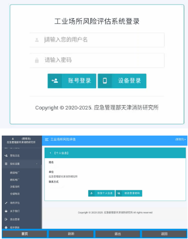 (1)工業場所火災風險評估APP,主要由個人信息、賬號管理、登錄日志、指標設置、工業場所評估、關于我們、程序更新七大模塊組成。