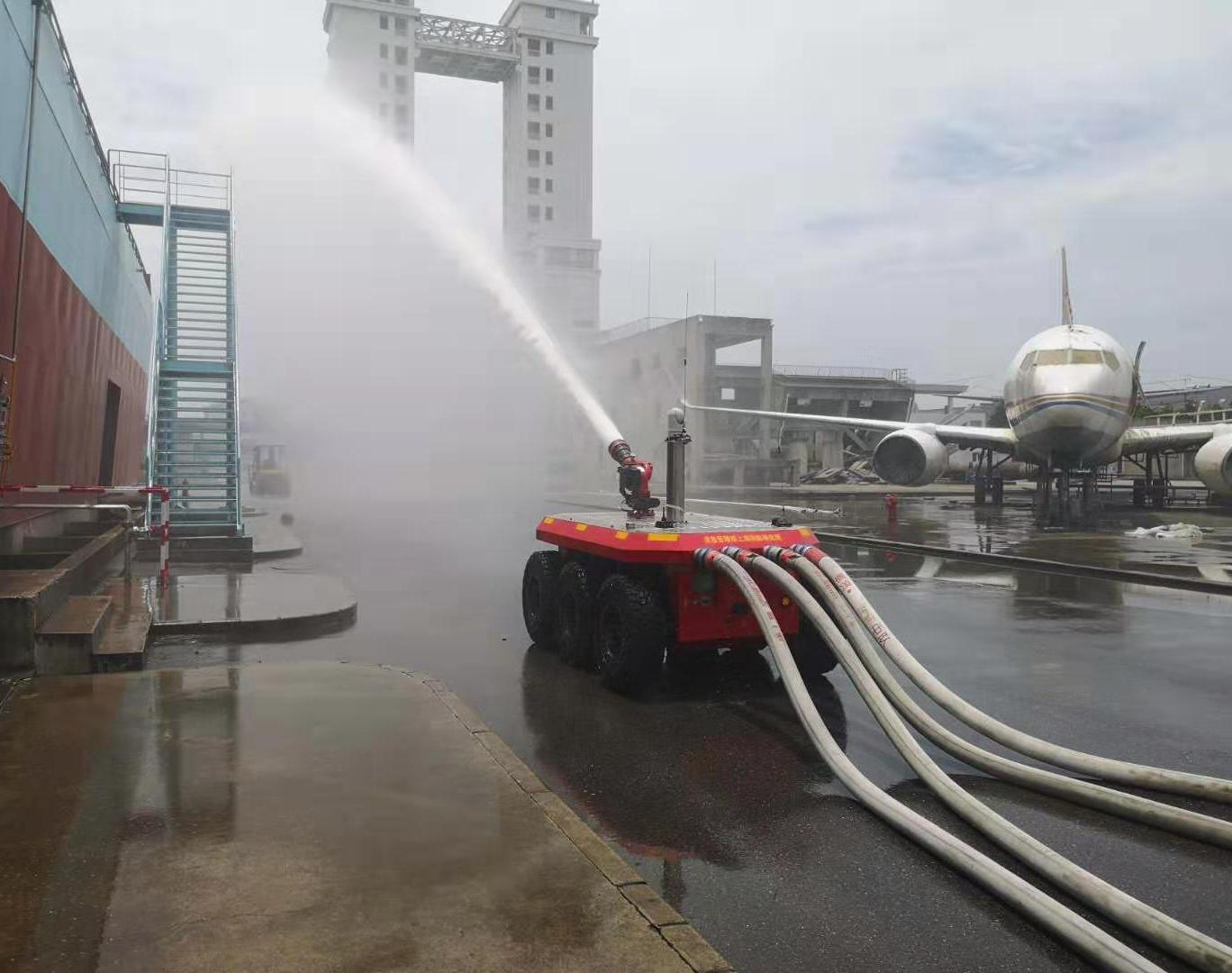 具有非視距遙操作功能的全地形消防機器人采用大行程縱臂式懸架、整體式承載框架、配合六輪全驅動設計,使其具有良好的地面自適應附著能力,能夠輕松的在沼澤、草地、坑洼路面、連續駝峰、碎石等路面行走,跨越500mm障礙物,攀爬30°斜坡;同時,動力系統采用大容量動力電池組,動力充沛,機器人能夠遠程拖拽四根充實的消防水帶前行,可負載超過550kg的重物;控制系統采用基于CAN總線的分布式模塊化設計,通用化接口,上裝可根據使用需求更換消防水炮、排煙機等不同功能模塊;機器人采用低延時的視頻傳輸系統,運用毫米波雷達透過煙霧探測火場障礙物,操縱者通過后場視頻圖像以及雷達探測圖可遠程操控機器人,真正意義實現在非視距條件下的無障礙遠程操作控制。