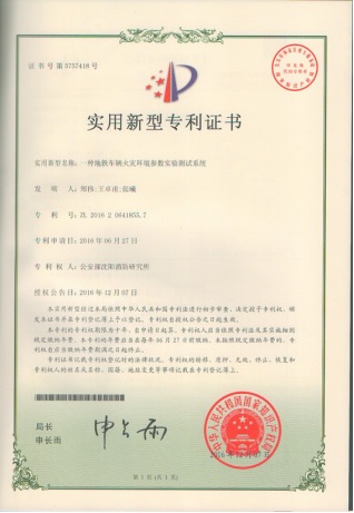 該成果取得了一項 “一種地鐵車輛火災環境參數實驗測試系統”(ZL 2016 2 0641855.7)實用新型專利。該標準實驗測試系統及方法已被遼寧省地方標準DB21/T 2755-2017《城市軌道交通車輛火災自動報警和細水霧滅火系統技術規程》采納。