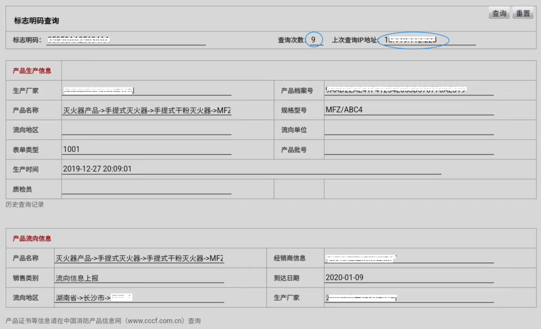 消防產(chǎn)品身份信息標志包括本體標志(紅色,俗稱A簽)和驗證體標志(黃色,俗稱B簽),每組標志均具有明碼和二維碼。現(xiàn)場檢查時,可通過手機掃描二維碼查詢產(chǎn)品信息,也可以將明碼輸入發(fā)證機構(gòu)的“消防產(chǎn)品流向信息查詢系統(tǒng)”查詢。 在查詢消防產(chǎn)品身份信息標志時,需校驗以下信息:①身份信息標志的查詢結(jié)果應(yīng)與產(chǎn)品銘牌標簽、產(chǎn)品檢驗報告(型式試驗)一致;②流向單位和經(jīng)銷商信息與實際情況一致;③從第2次查詢開始,會顯示查詢次數(shù)和上次查詢的IP地址。