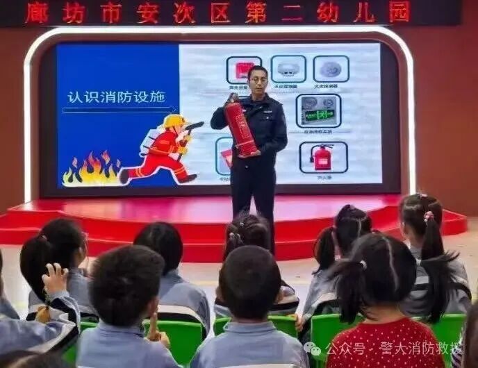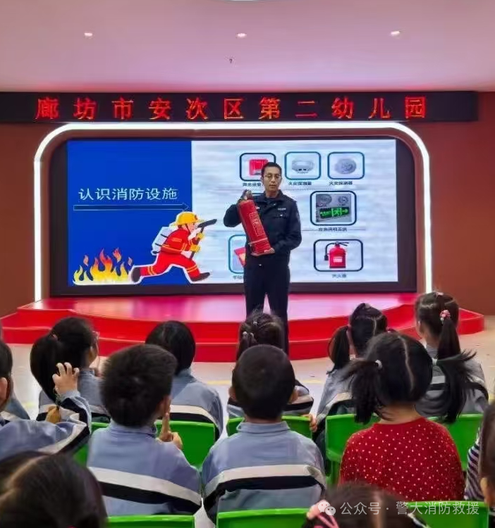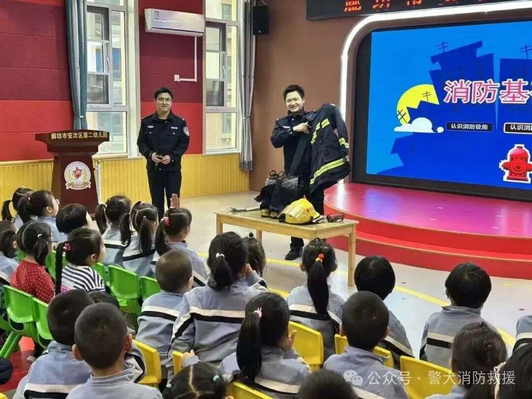 “119!” 伴隨著清脆響亮的回答,一堂生動有趣的消防安全課在廊坊安次區第二幼兒園正式拉開帷幕。在全國消防日來臨之際,中國人民警察大學救援指揮學院的師生們走進幼兒園,通過講解、互動與體驗,為孩子們帶來了一次零距離的消防安全啟蒙。 直觀感知:戰斗服里的守護