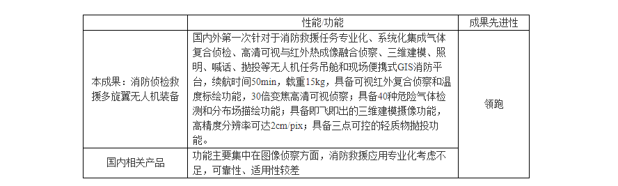 該成果立足于消防救援應用領域,從總體設計、智能控制、作業載荷方面實現對無人機技術可靠性、安全性和專業性改良。