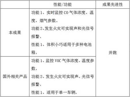 該成果依托公安部技術研究計劃項目《電動汽車電氣火災防護技術研究項目》(項目編號:2016JSY****28 ),搭建了化學儲能與充放電裝置火災安全性實驗平臺,完成多種電池在不同工況下的熱失控模擬實驗,采集實驗中的氣體、溫度、煙霧數據,研究了電池火災探測的技術模型,形成了火災報警技術解決方案,研制了電動汽車電氣火災防控產品樣機,制定了新能源汽車電池火災報警器產品標準草案,實現了電動汽車電池熱失控的預警監控。該成果與國內外同類先進產品比較如下: