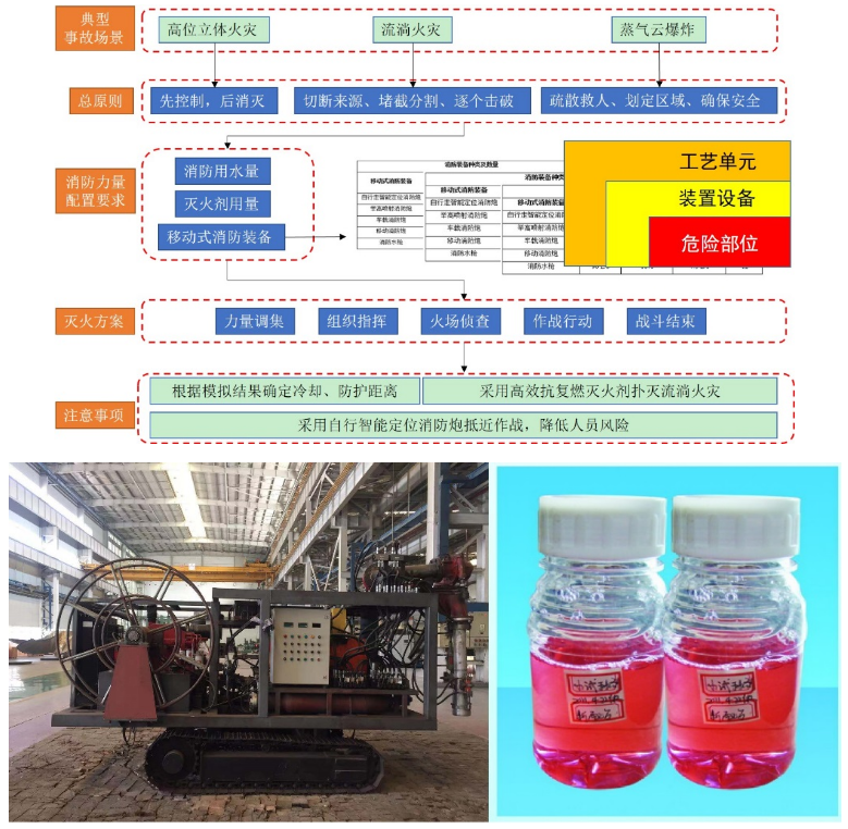2、提出了石油化工工藝裝置火災典型事故場景的滅火救援力量配置要求,制訂了典型事故場景下在危險部位—裝置設備—工藝單元等不同層級需要采取的滅火救援技戰術組合方案,將滅火救援與工藝控制措施相結合提出了火災事故的預防措施建議;