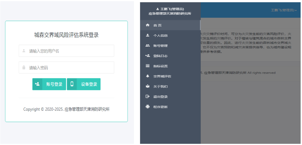 (1)城鎮(zhèn)-森林交界區(qū)域火災風險評估APP,主要由個人信息、賬號管理、登錄日志、指標設置、交界域評估、關(guān)于我們、程序更新七大模塊組成。