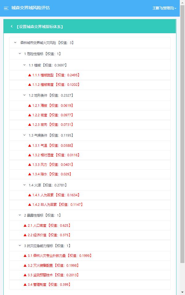 針對影響城鎮(zhèn)-森林交界區(qū)域火災風險的關(guān)鍵因素,軟件可進行指標設置,形成多參量的風險評價指標體系,以此可對某一交界區(qū)域進行火災風險評估,并給出風險分級。