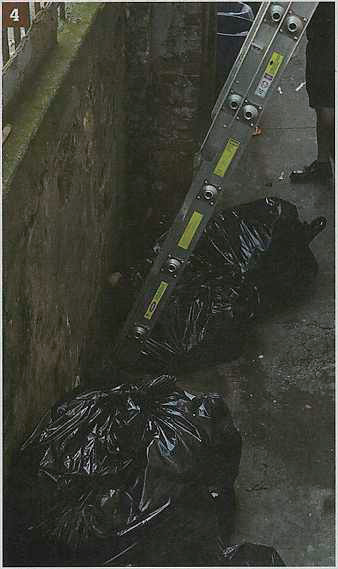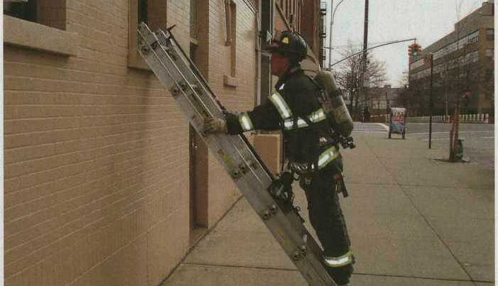 面對鐵柵欄時,在一樓搭梯子的一個簡單而快速的解決方案是使用 A 型架組合梯。不要從人行道上部署這種梯子,以懸臂的姿勢越過圍欄。梯子在這個位置時,將很難攀爬、橫移和操作。當你和受害者在上面移動時,它也可能從窗臺滑落。如果它滑出窗臺,你和受害人都可能向下墜入”護城河”而受傷(照片 3)。