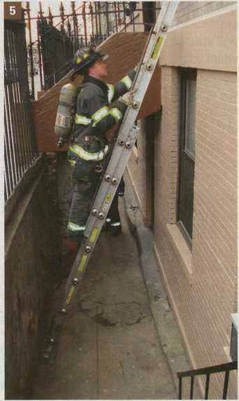 當你爬上梯子時,你可能要從側面登上梯子。由于梯子的屁股靠著地基墻,在有限的空間內,你可能無法佩戴自給式呼吸器(SCBA)從最低的梯子爬上去。另外,在下來的時候,你將無法在底層梯子上走下來,你必須走到一邊。由于受害者沒有佩戴 SCBA,即使有墻在那里,他們通常也能從梯子上走下來。但是,一定要確保你支持他們,直到他們走到地面上(照片 5)。
