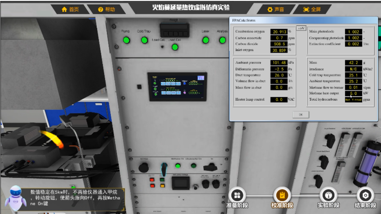 火焰蔓延量熱儀虛擬仿真實驗軟件項目以實驗室、FPA儀器、通風柜、空氣壓縮泵、水閥、電源開關箱和管道為對象建立虛擬訓練場景,主要操作練習模塊包括設備認知、儀器打開前的準備工作、儀器校準工作、PMMA材料燃燒性能測定以及結束階段模塊。通過本實驗,幫助學習者進行FPA操作練習,提高人員大型設備操作和測試能力。